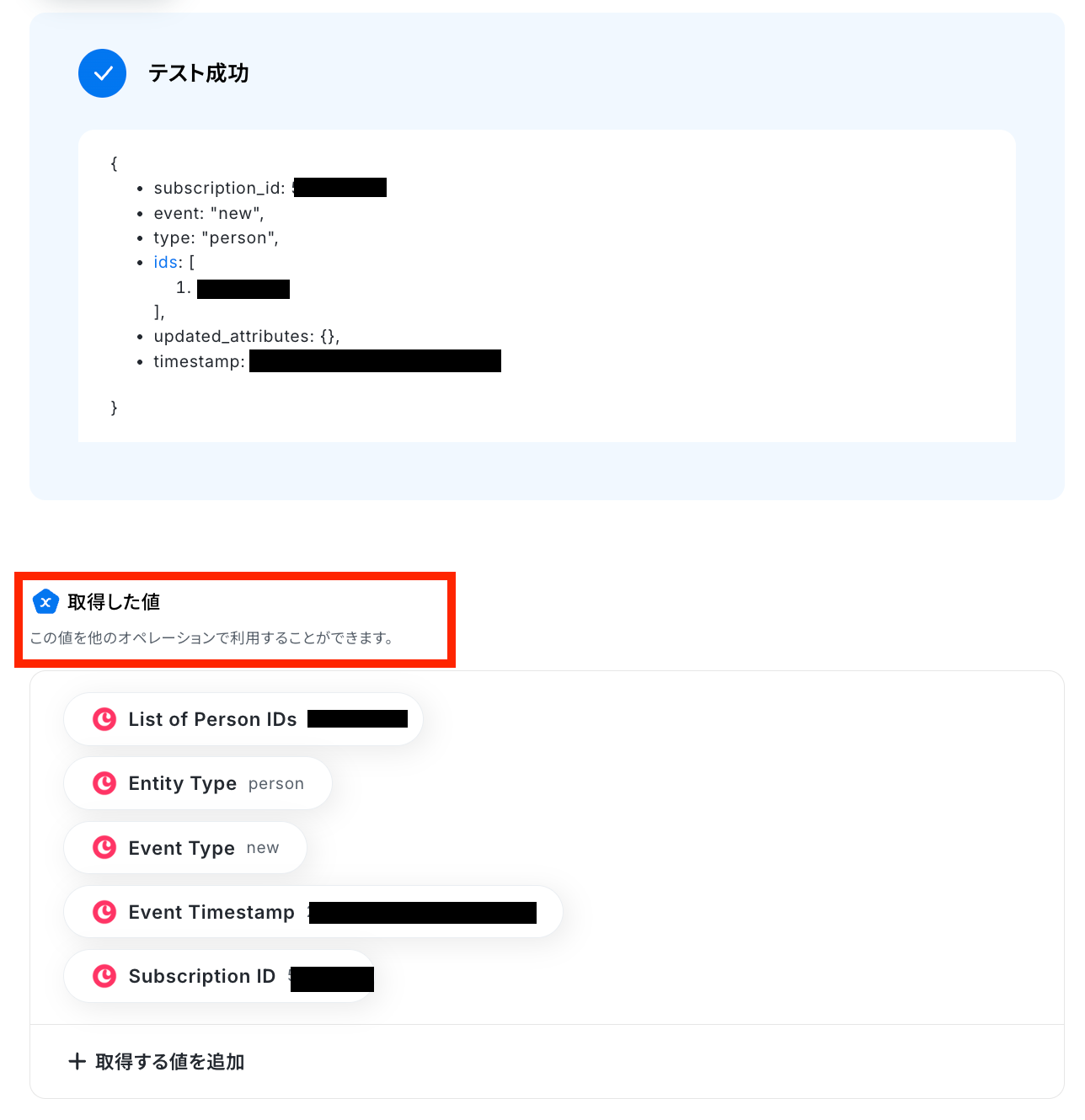 テスト成功で、取得した値が取得されます。確認ができたら、「完了」ボタンを押して、最後に設定を保存しておきます。