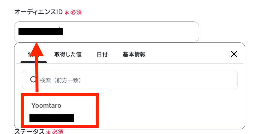 - Mailchimpでコンタクトを追加するアクションを設定する際に、追加対象としたい任意のオーディエンスIDを設定してください。