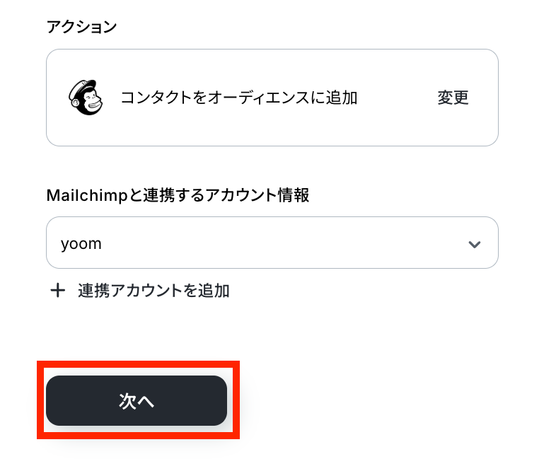 - 最後に、オペレーションでMailchimpの「コンタクトをオーディエンスに追加」アクションを設定し、参加者情報を指定のオーディエンスに追加します。