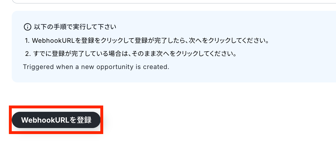 「WebhookURLを登録」をクリックして、対象のCopperのアカウントにWebhookを登録します。