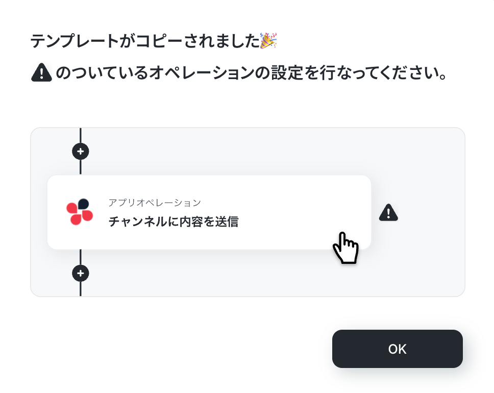 - 最後に、オペレーションでLINE公式アカウントの「テキストメッセージを送信する」アクションを設定し、条件に合致した場合に指定のユーザーへ通知します