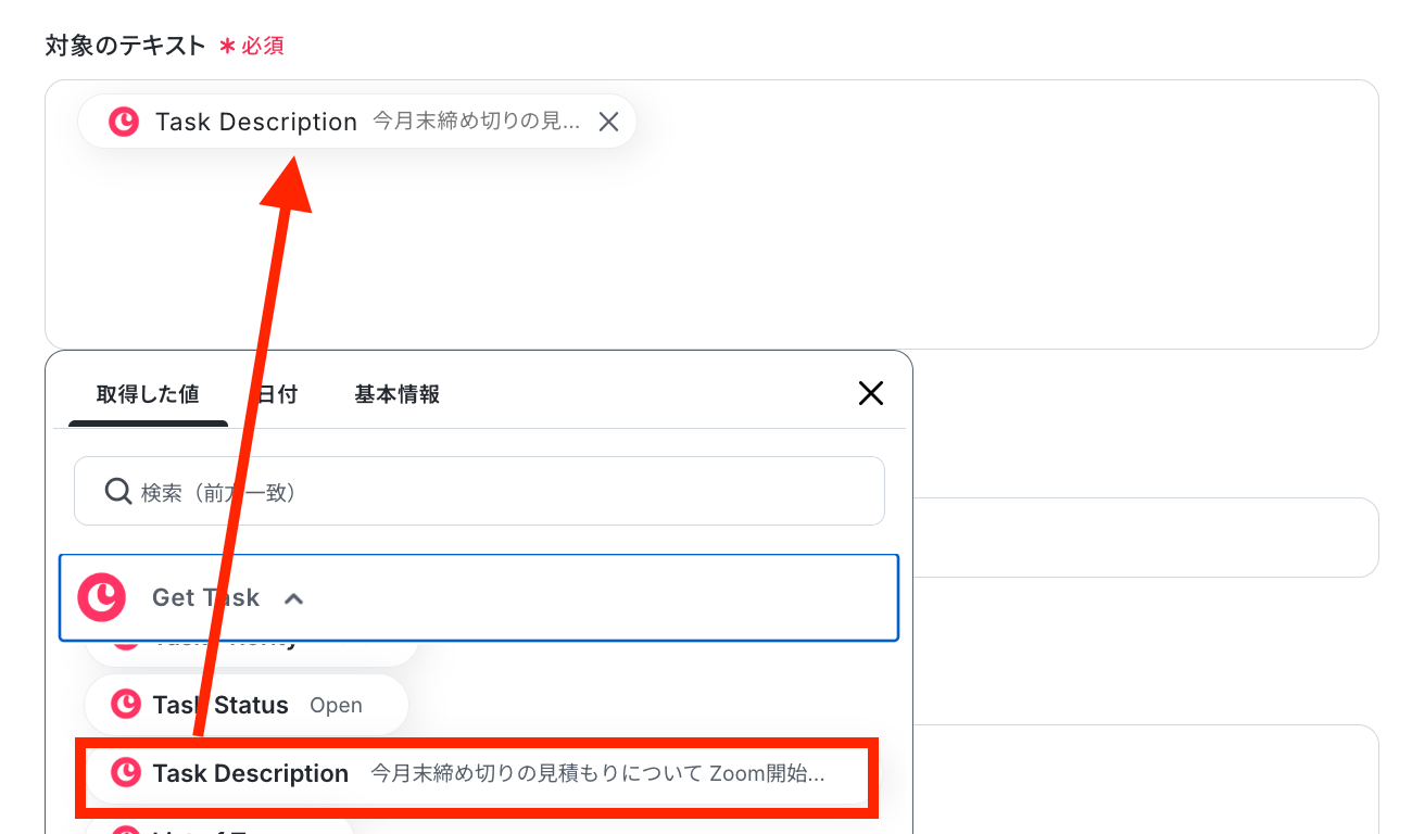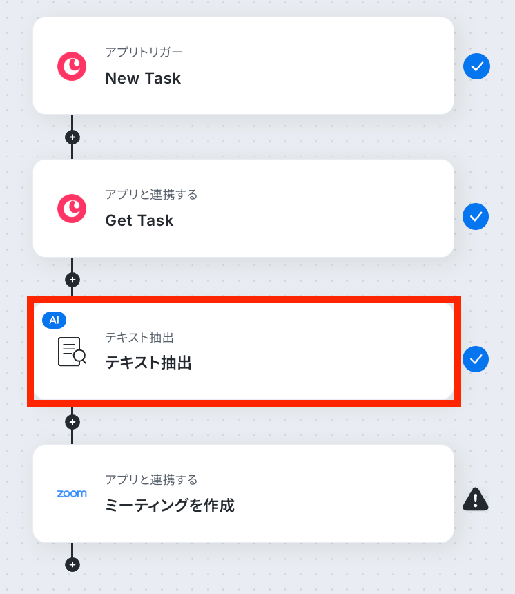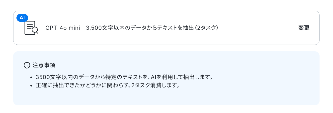 - 次に、オペレーションでAI機能の「テキストを抽出する」アクションを設定し、取得したタスク情報から投稿に必要なテキストを抽出する