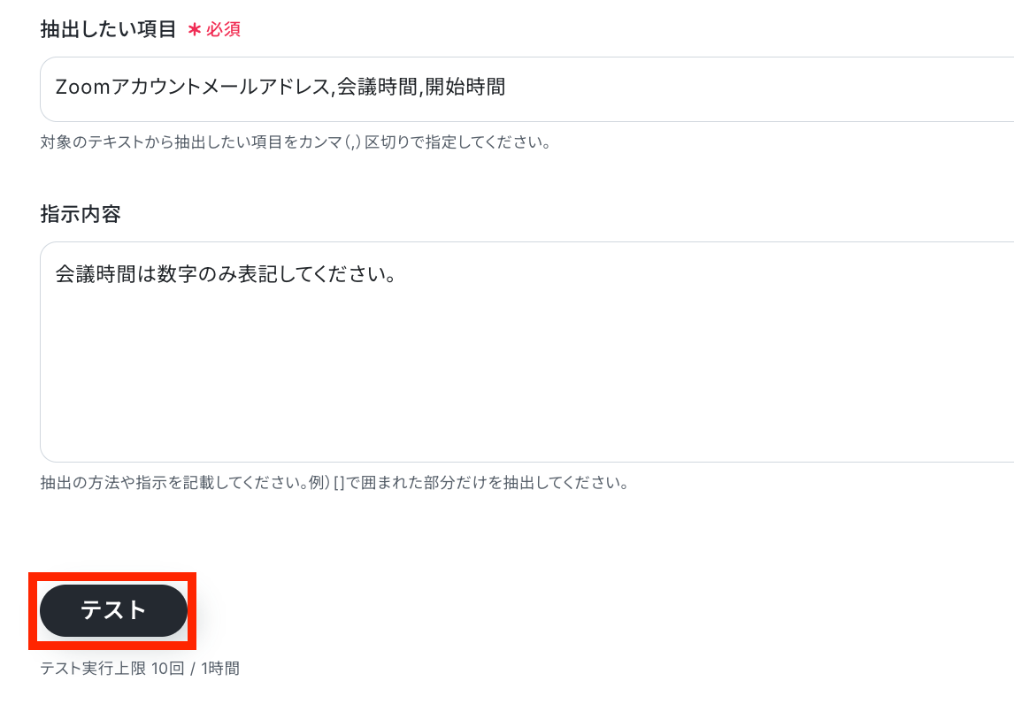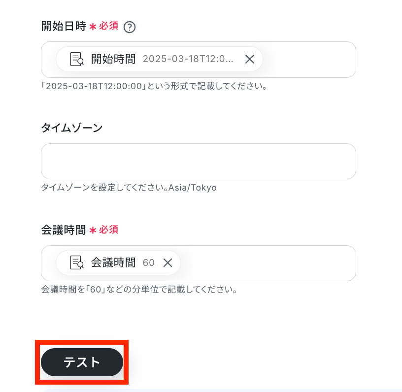 ※次のZoomのアクション設定の際に登録形式があるため、指示内容に会議時間の表記の仕方を記載しています!