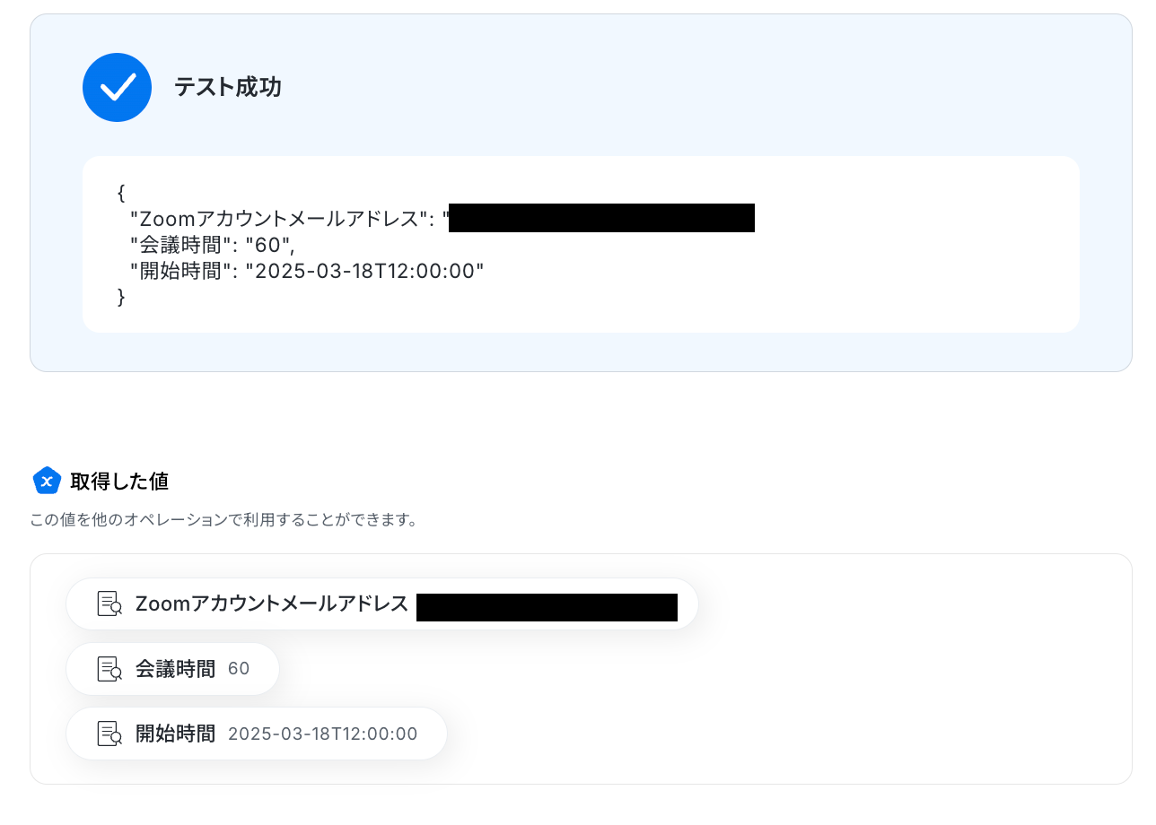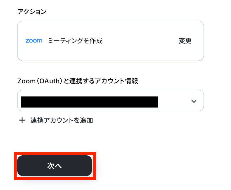 - 最後に、オペレーションでZoomの「ミーティングを作成する」アクションを設定し、抽出した情報をもとにミーティングを作成します。