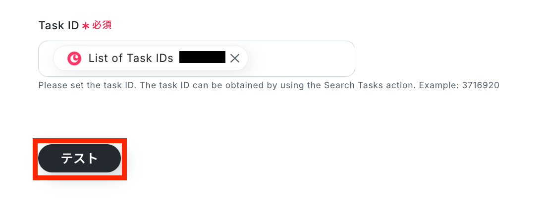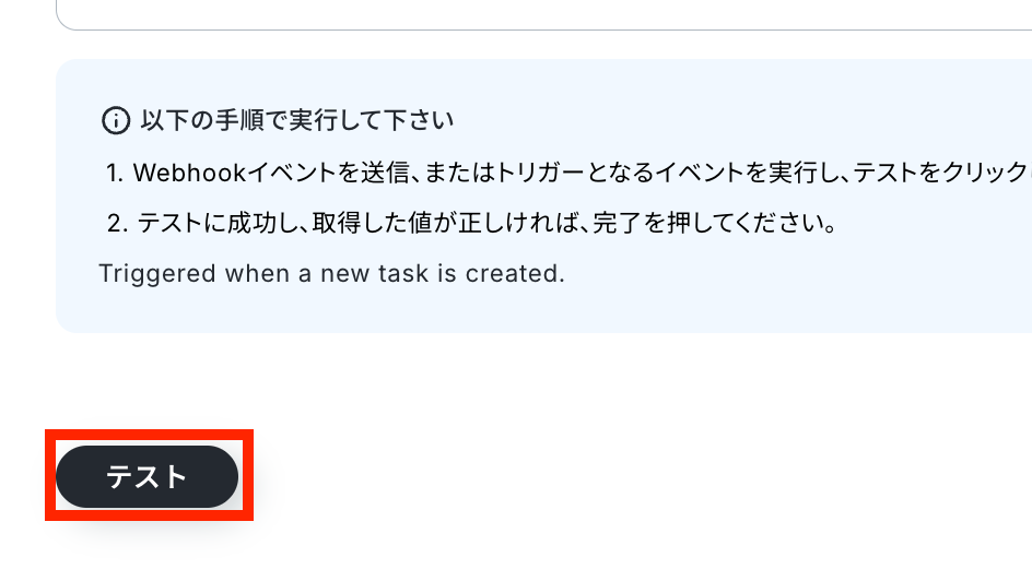 タスクが作成できたら、Yoomの設定に戻り「テスト」ボタンをクリックしましょう!