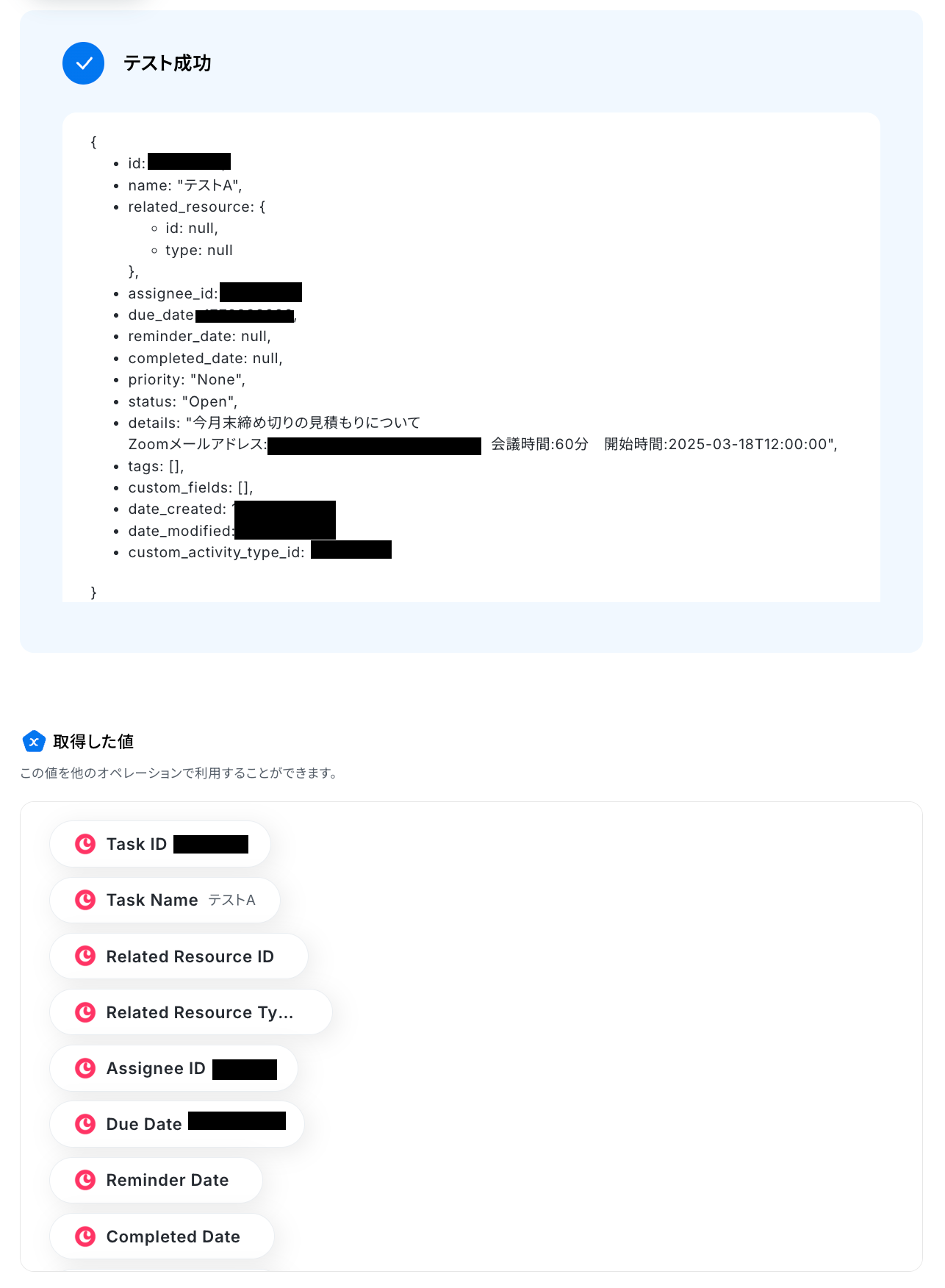 - 次に、オペレーションでCopperの「タスク情報を取得する」アクションを設定し、トリガーで検知したタスクの詳細情報を取得する