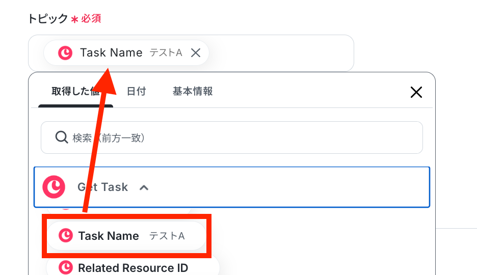 - 分岐機能の設定では、例えばタスク名に特定のキーワードが含まれている場合のみ後続のアクションが実行されるよう、任意の分岐条件を設定してください