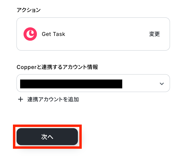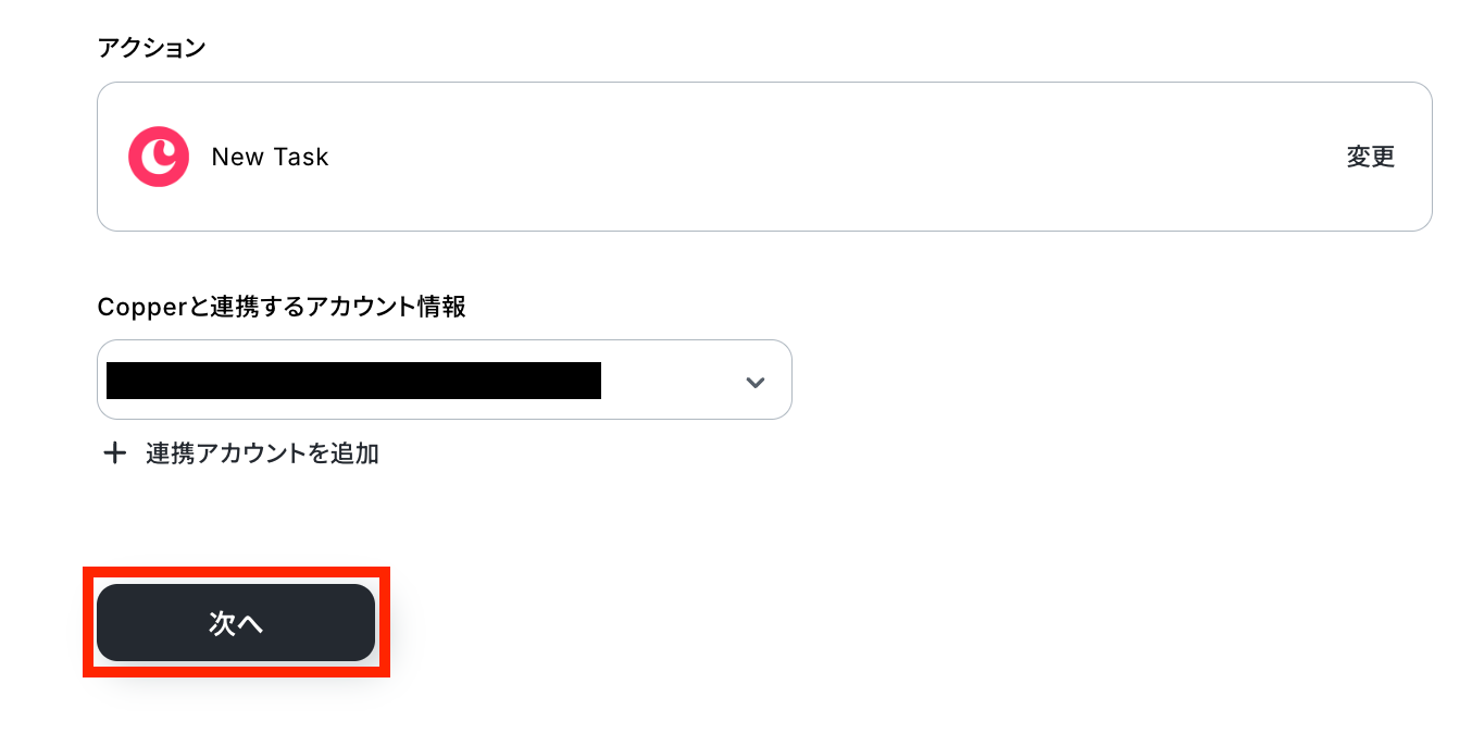 アクションは「New Task」のままで、アカウントが連携されていることが確認できたら、「次へ」をクリックして進んでください。