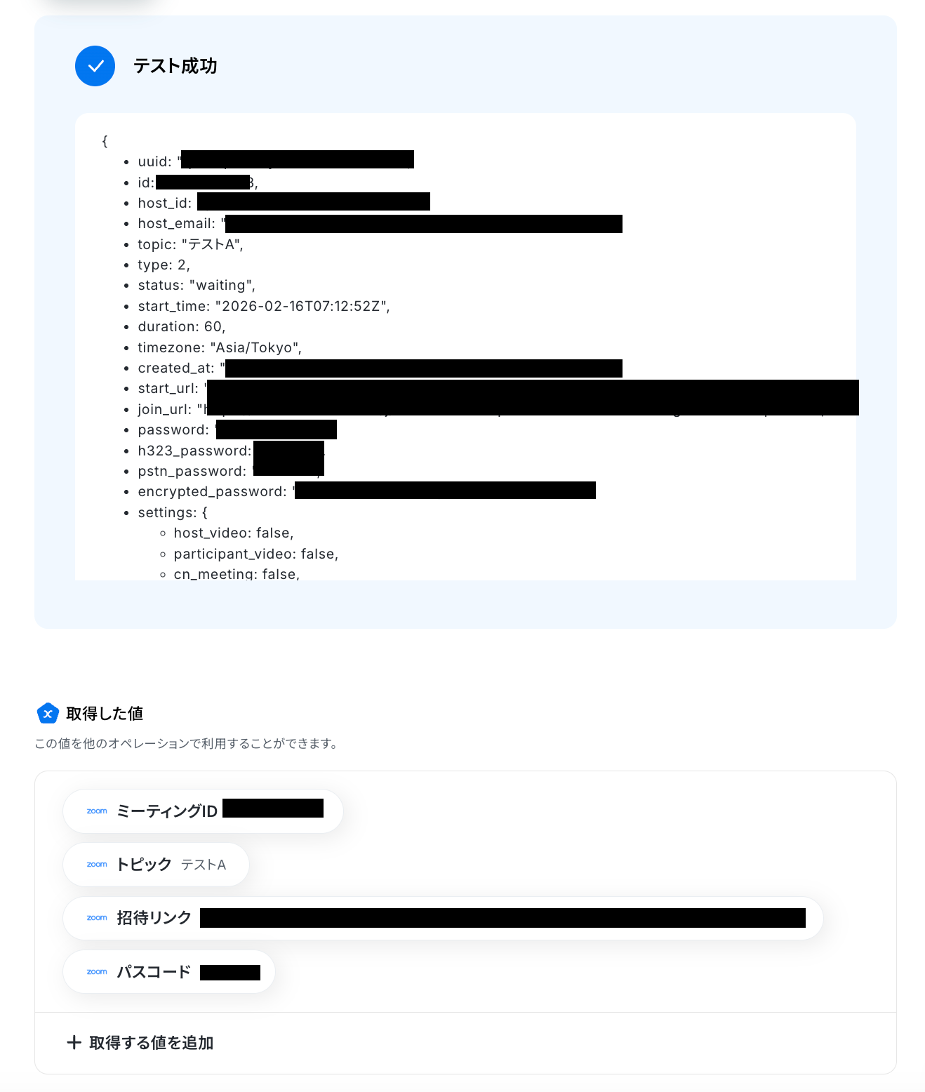 取得した値を利用してZoomでミーティングを追加する設定を行います。
