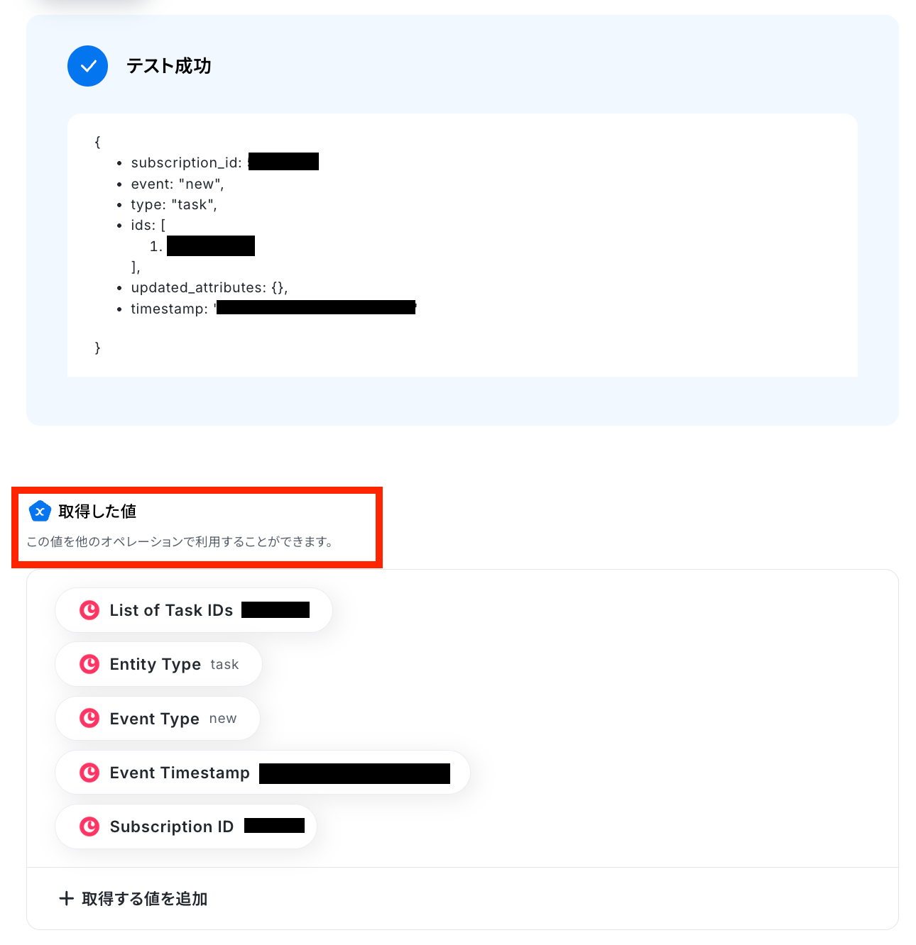 テスト成功で、抽出された項目が取得した値に反映されています。