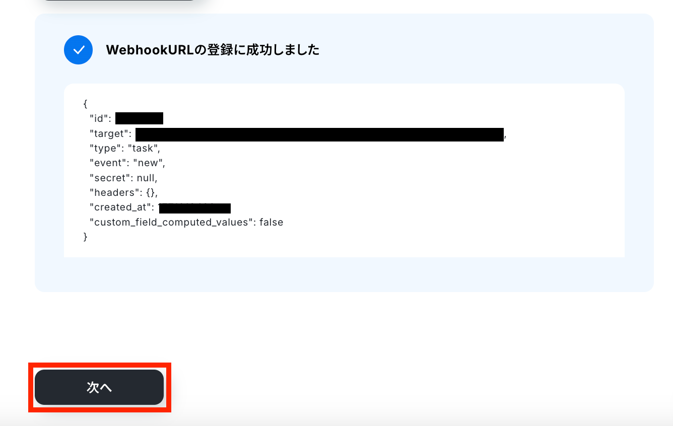 Webhookの登録に成功したら、「次へ」ボタンで次の設定へ進みます。