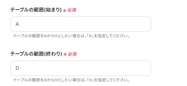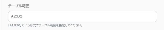 テーブル範囲の始めと終わりを指定します。Google スプレッドシートのシートの範囲です。