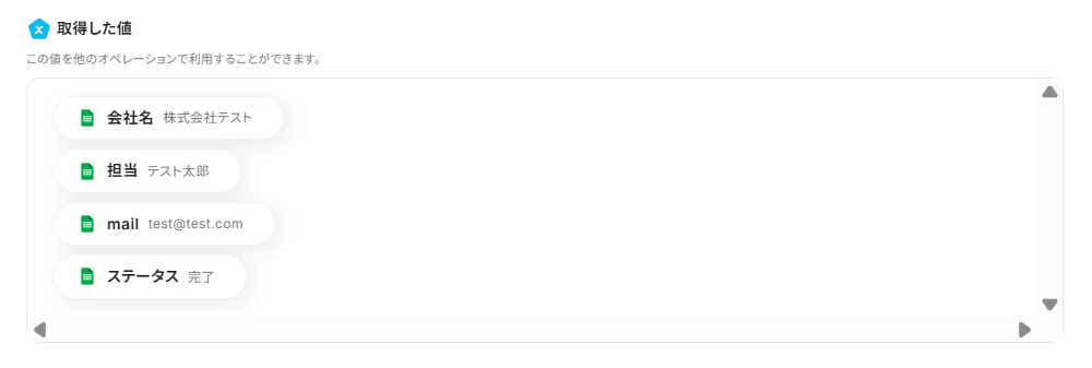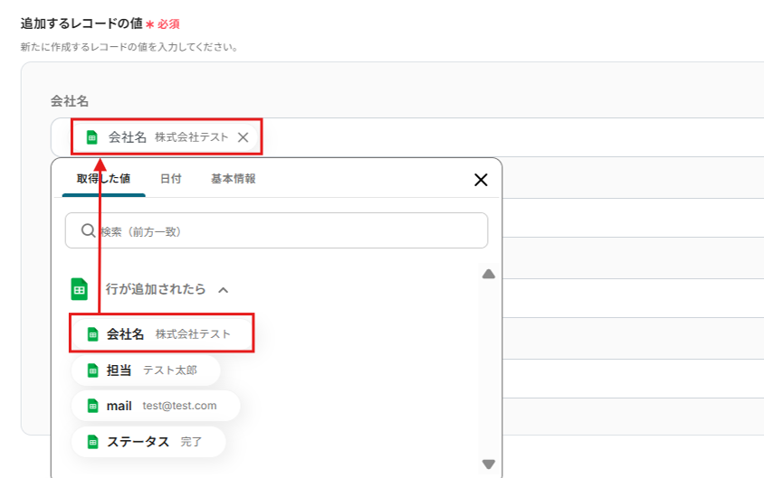 続いて、追加するレコードの値を設定していきましょう。 Google スプレッドシートの指定したテーブル範囲にあるヘッダがボックスの項目として表示されます。 追加するレコードの値に、先ほど取得した値から選択します。