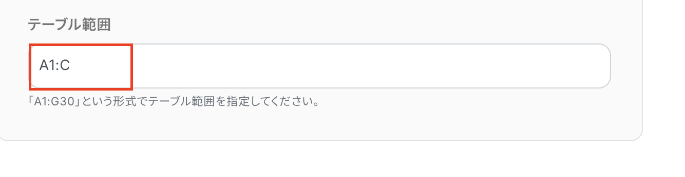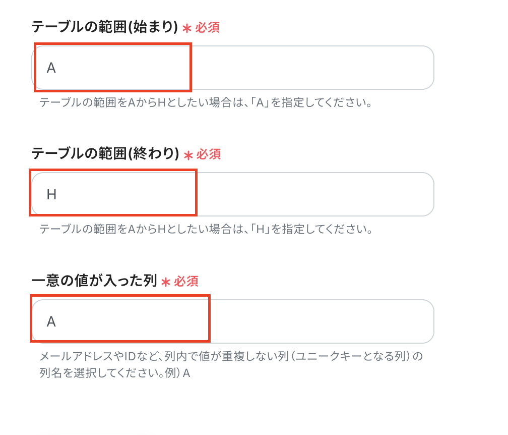 テーブルの範囲(始まり)、テーブルの範囲(終わり)、一意の値が入った列を設定しましょう。 特に一意の値が入った列は必ず一意の値となるGoogle スプレッドシートのデータ を設定してください。 値が重複していると正しく動かない場合があります。 設定後、テストを実行しましょう。