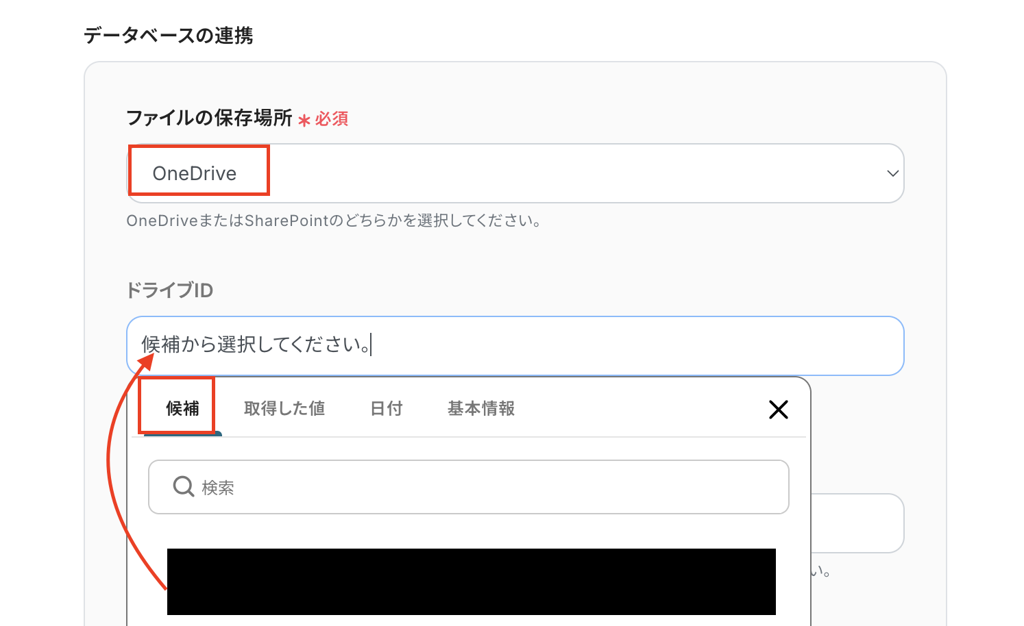 ファイルの保存場所を選択しましょう。 ドライブIDは候補から選択します。
