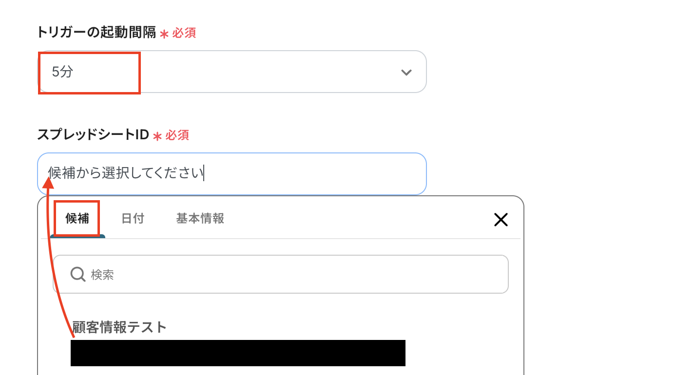 トリガーの起動間隔を設定します。 トリガーの起動タイミングは、5分、10分、15分、30分、60分のいずれかで設定できます。ご利用プラン によって、設定できるトリガーの最短間隔が違うので、その点は要チェックです。 基本的にはそのプランの最短の起動間隔にしてお使いいただくことをおすすめします。 スプレッドシートIDは候補から選択しましょう。