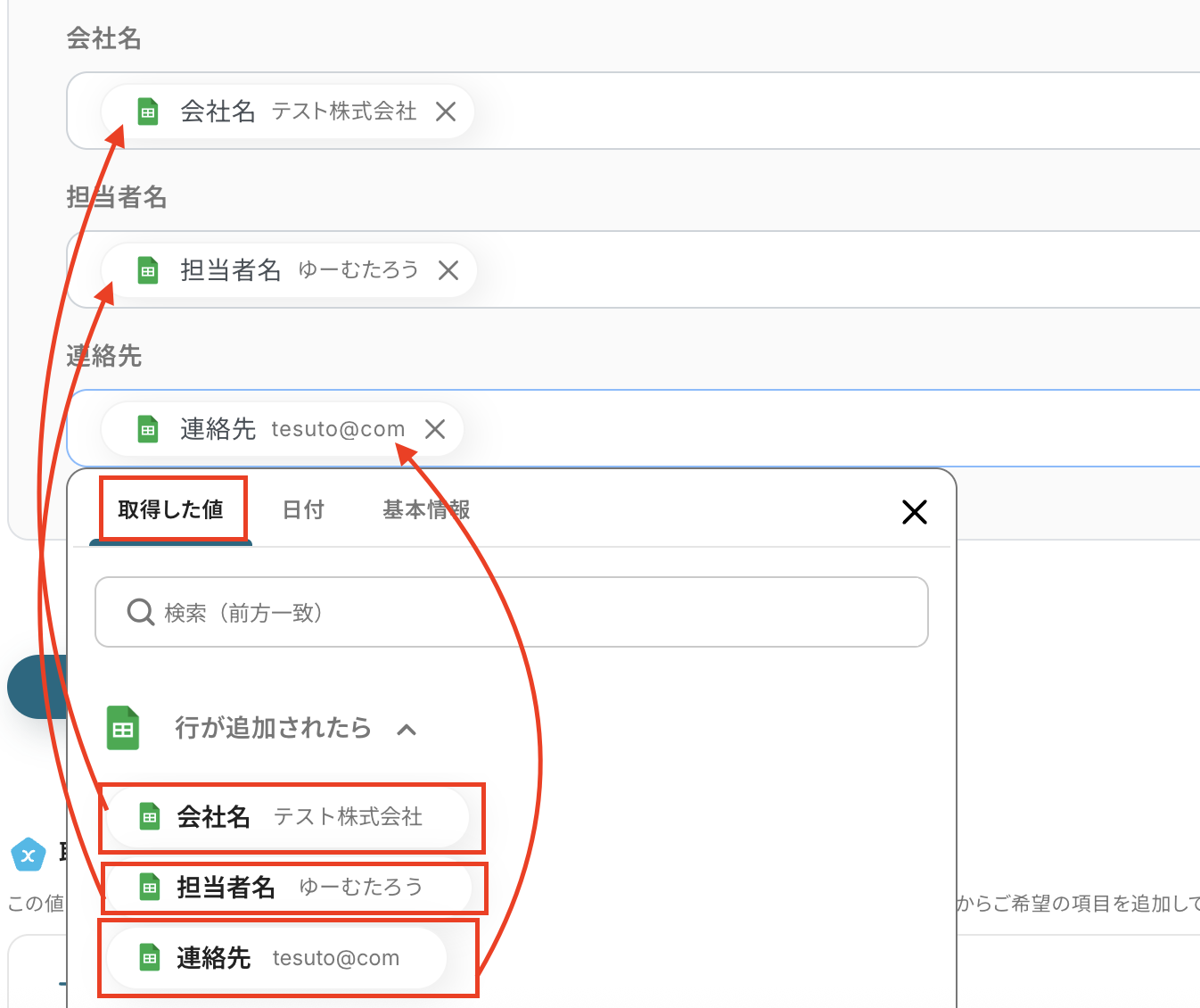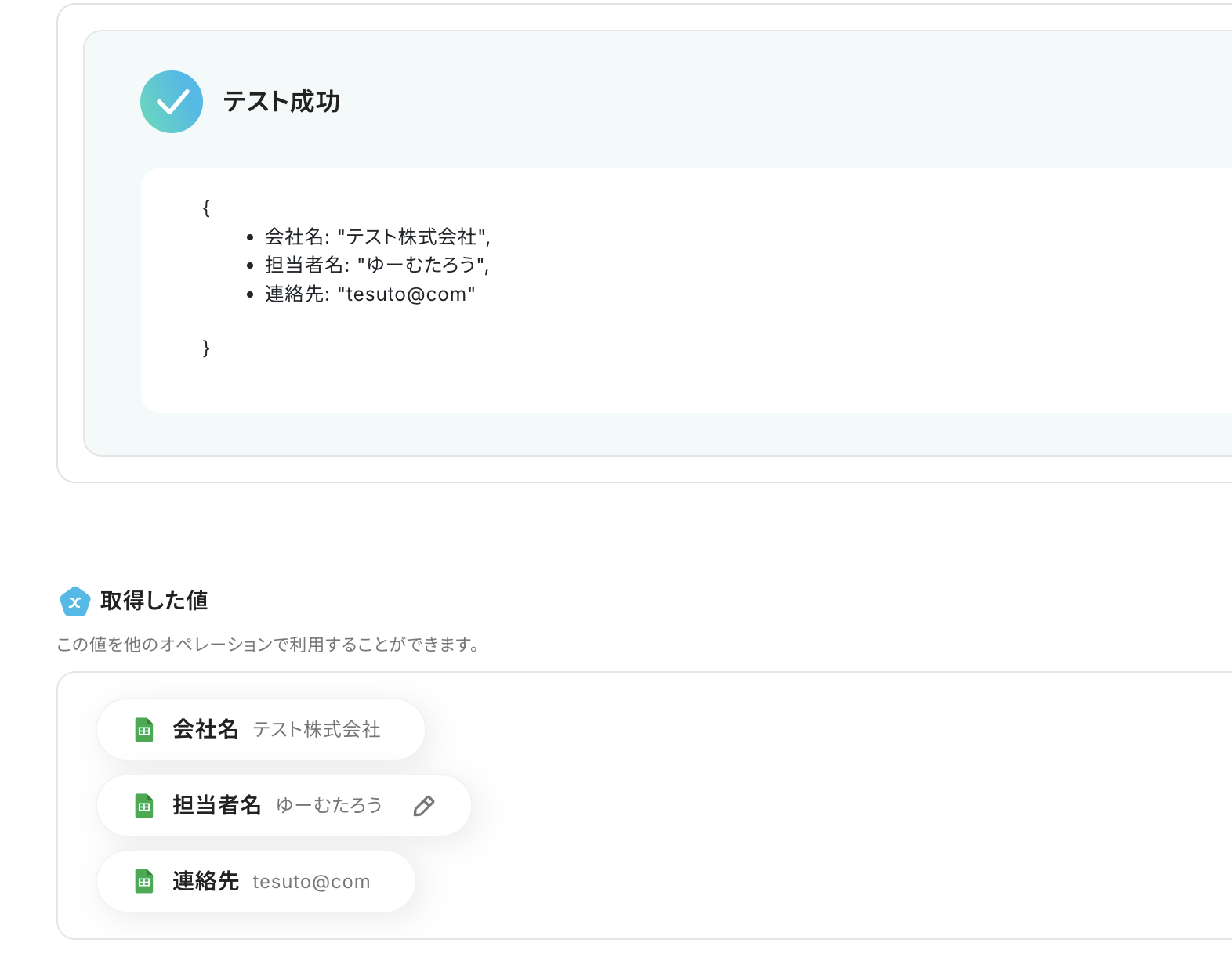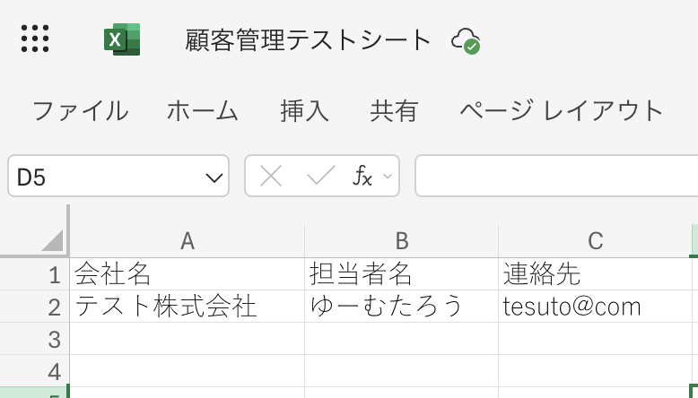 Microsoft Excelのレコード情報が表示されていると思います。 Google スプレッドシートの取得する値から各項目を設定しましょう。 ここで取得した値を使わずに入力すると同じ内容が追加され続けることになるため、注意しましょう。 詳細についてはこちら を参考にしましょう。 設定後、テストを実行します。