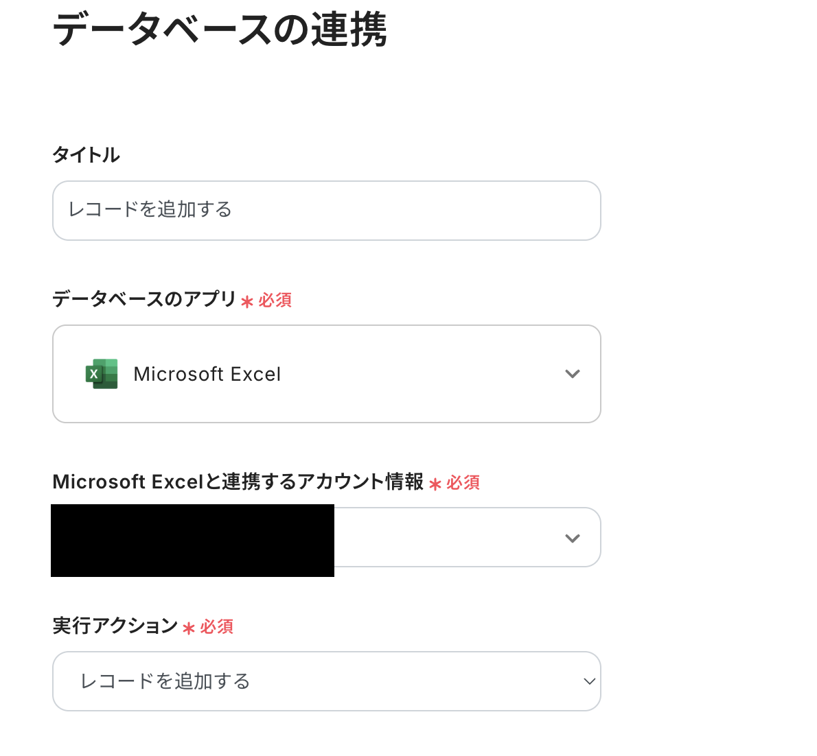タイトルは変更できます。 Microsoft Excelと連携するアカウント情報を確認してください。 アクションは「レコードを追加する」が選択されています。