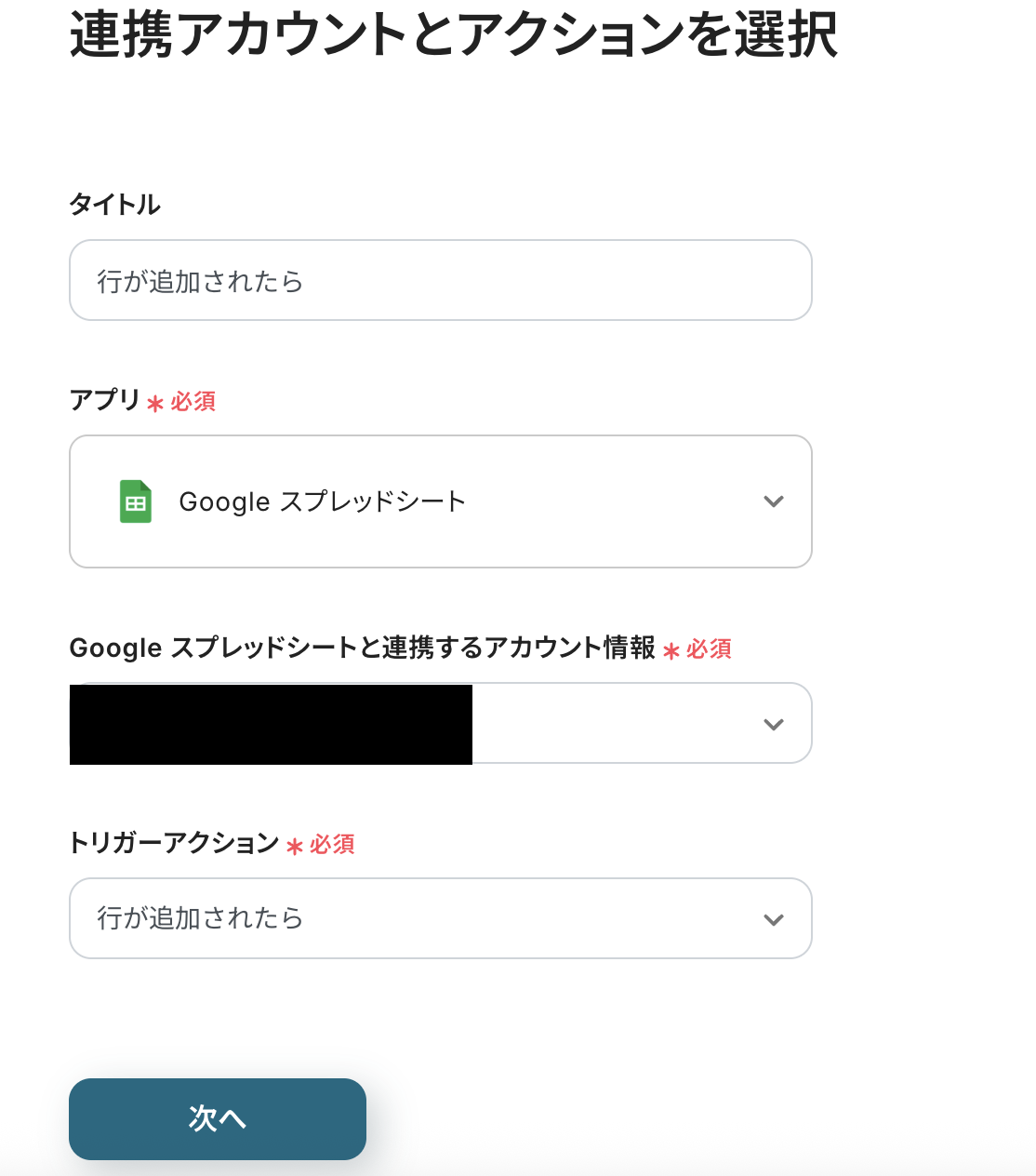 タイトルはコピーした時点で入力されていますが、変更できます。 Google スプレッドシートと連携するアカウント情報を確認しましょう。 トリガーアクションは「行が追加されたら」が選択されています。 確認後、次へをクリックしましょう。