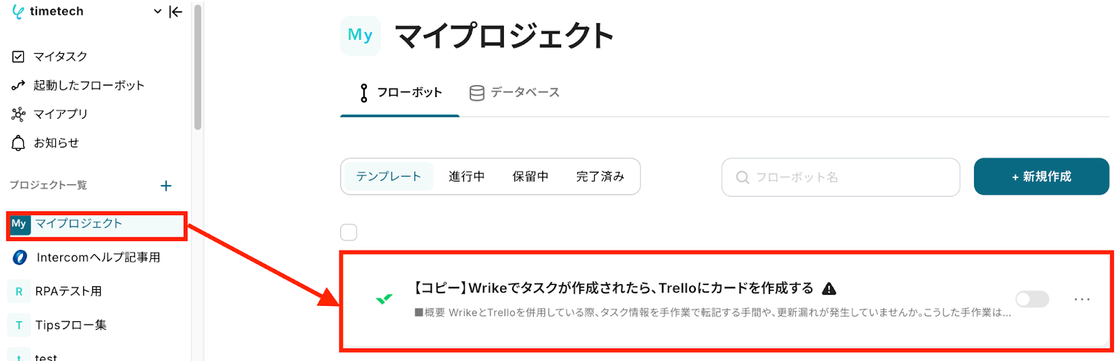 左側にあるメニューの「マイプロジェクト」から、コピーしたテンプレートを開きます。