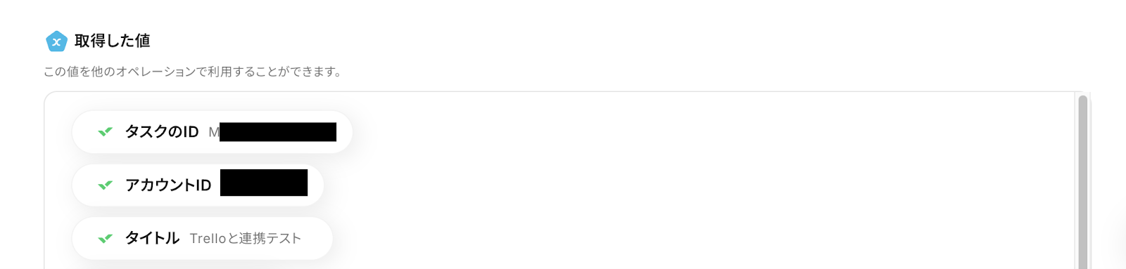 テストに成功すると「取得した値」としてWrikeで作成したタスクの情報がアウトプットされます。