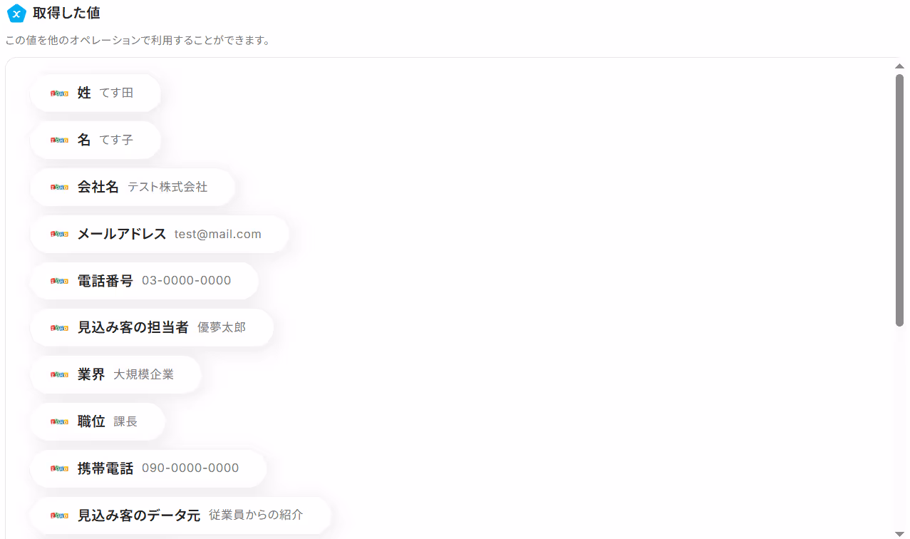トリガーやオペレーション設定時に、「テスト」を実行して取得した値のことです。