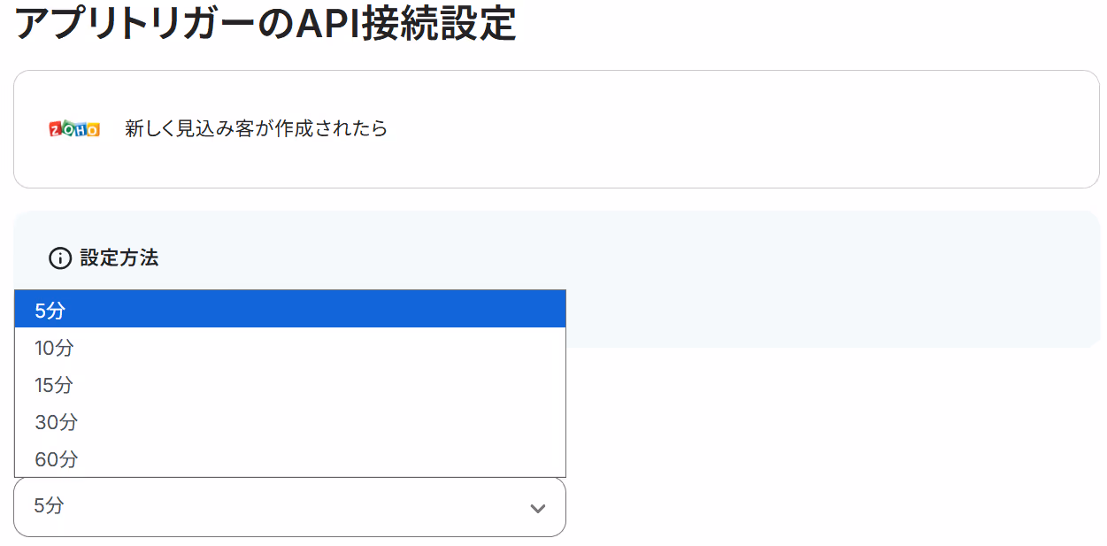 アプリトリガーのAPI接続設定という画面が表示されるので、まずトリガーの起動間隔をプルダウンから選択しましょう。