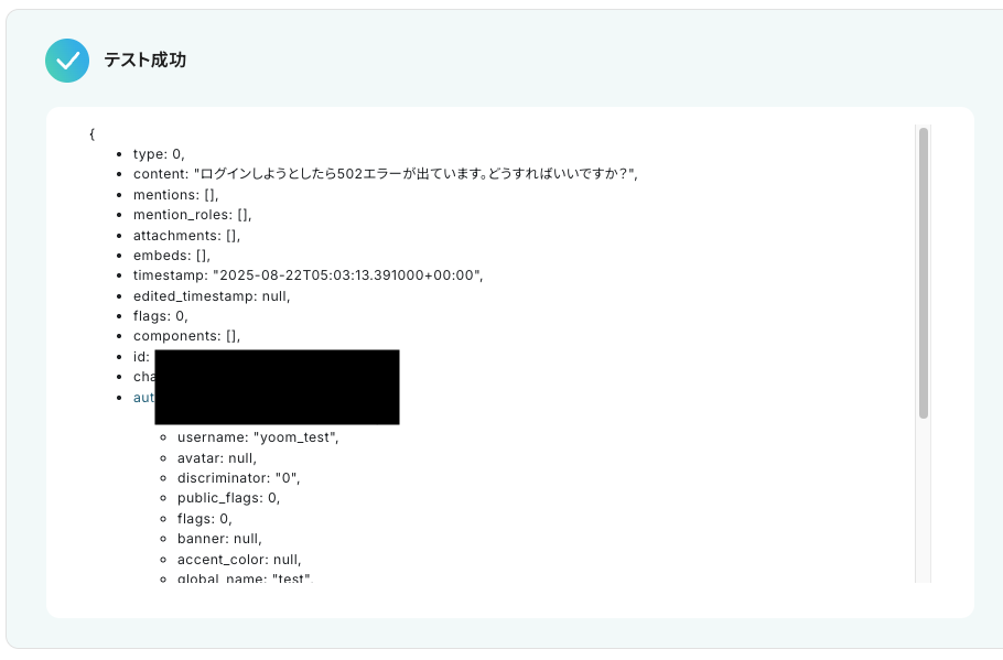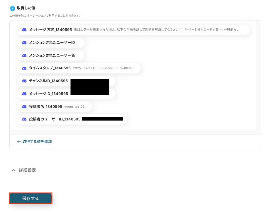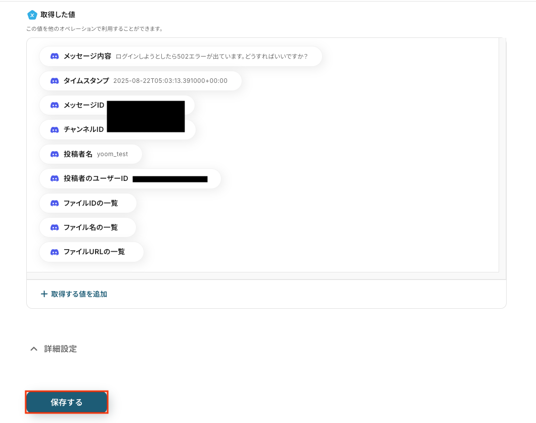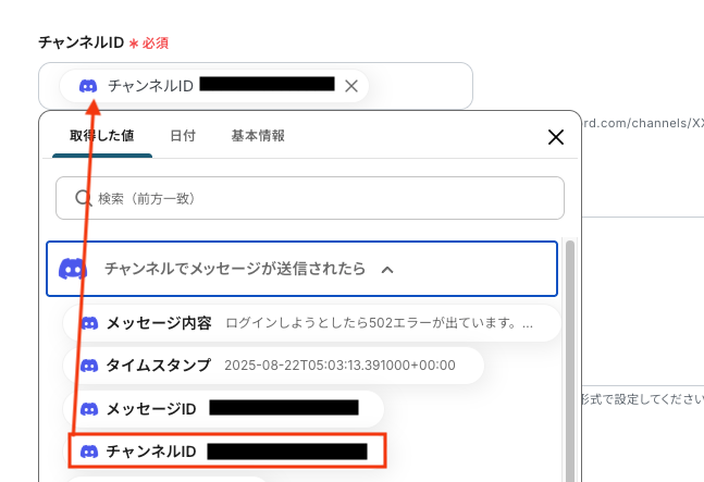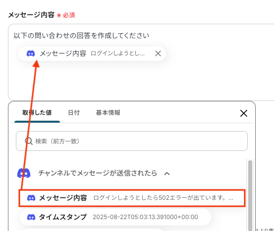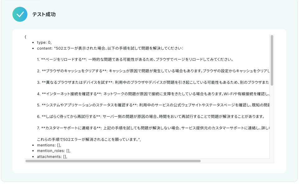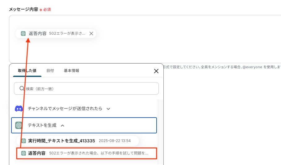 - Discordへの通知設定では、トリガーで受け取った元のメッセージ情報やChatGPTが生成した要約結果を変数として埋め込んだりするなど、柔軟なカスタマイズが可能です。