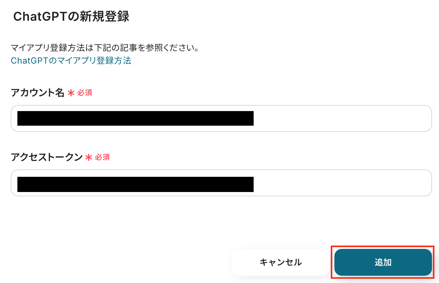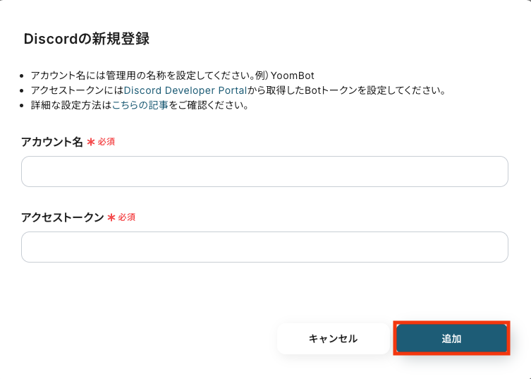 以下の画面が表示されるので、アカウント名とアクセストークンを入力し「追加」をクリックしましょう。