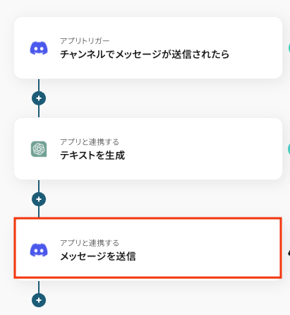 - 最後に、Discordの「メッセージを送信」アクションを設定し、ChatGPTによって生成された要約文を指定したチャンネルやダイレクトメッセージに送信します。