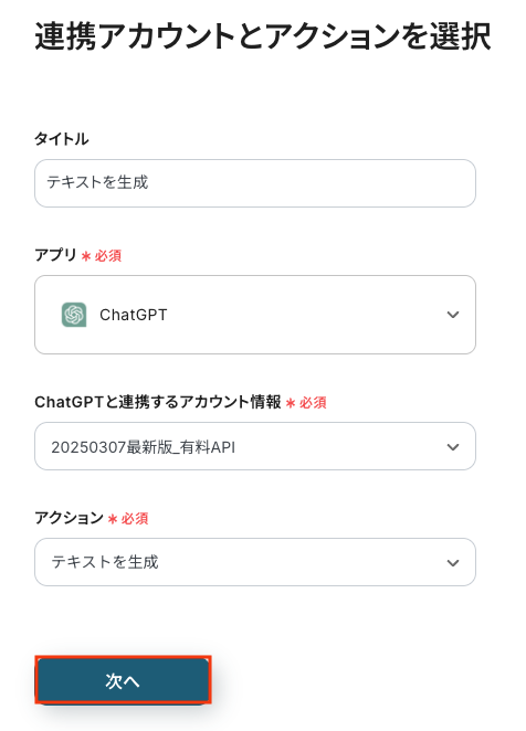 - 次に、オペレーションでChatGPTを選択し、「テキストを生成」アクションを設定して、フォームの回答内容を基に文章を作成するよう指示します