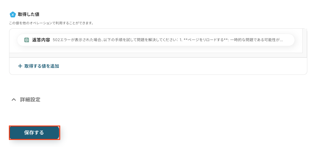 これにより、すべての投稿ではなく指定したキーワードを含むメッセージだけがワークフローを起動するため、ChatGPT APIの呼び出し回数を削減し、コストを抑えた利用が可能です。