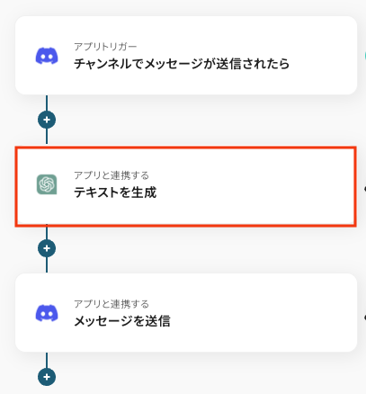 - 最後に、オペレーションで再度Discordを選択し、「メッセージを送信」アクションを設定し、ChatGPTが生成したテキストを指定のチャンネルに送信します。