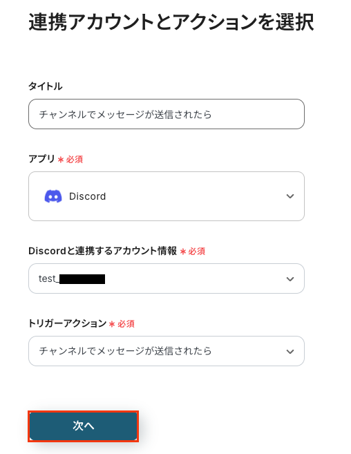 - トリガーでDiscordの「チャンネルでメッセージが送信されたら」というアクションを選択し、監視したいチャンネルを指定します。