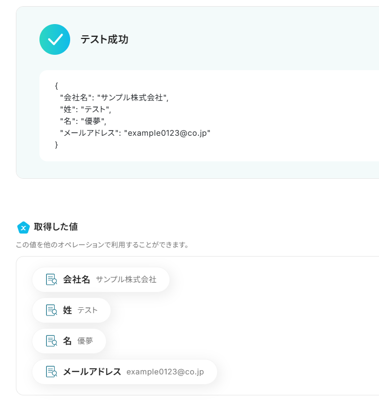 5.入力を終えたら「テスト」をクリックし、「取得した値」にデータが抽出されていることを確認してください。