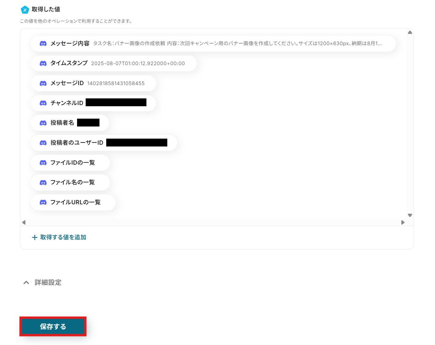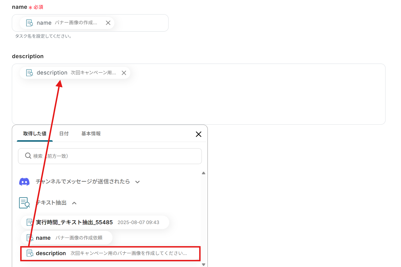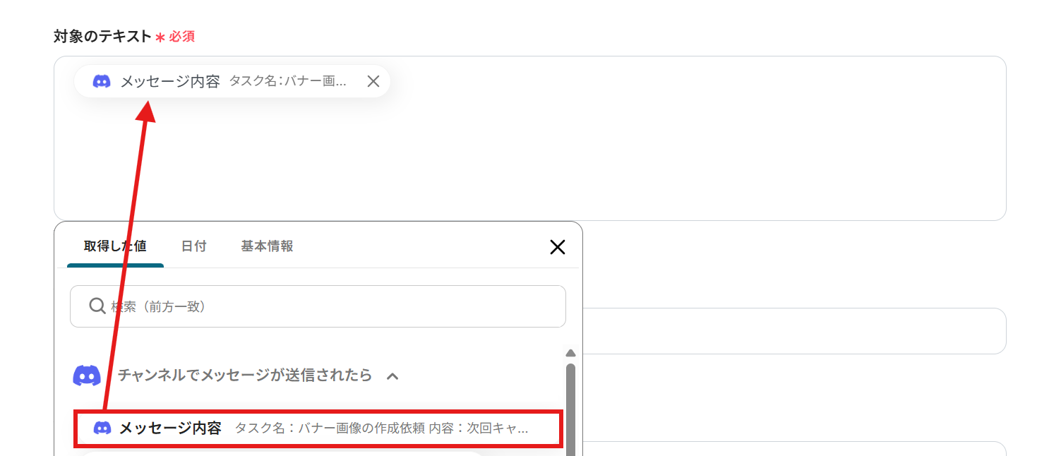 対象のテキスト:抽出対象のテキストを指定しましょう。編集欄をクリックするとDiscordから取得した情報を引用できます。今回は以下のようにメッセージ内容をそのまま引用しています。取得した値を活用することで、手入力による転記ミスも防げます。