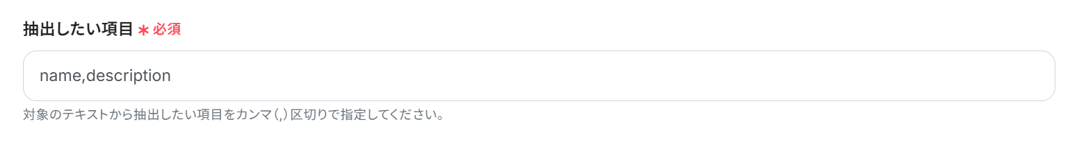 抽出したい項目:デフォルトでは、name、descriptionを抽出するように設定されているので、そのままにします。追加で抽出したい項目がある場合は、カンマ(,)区切りで入力することでデータを抽出できます。