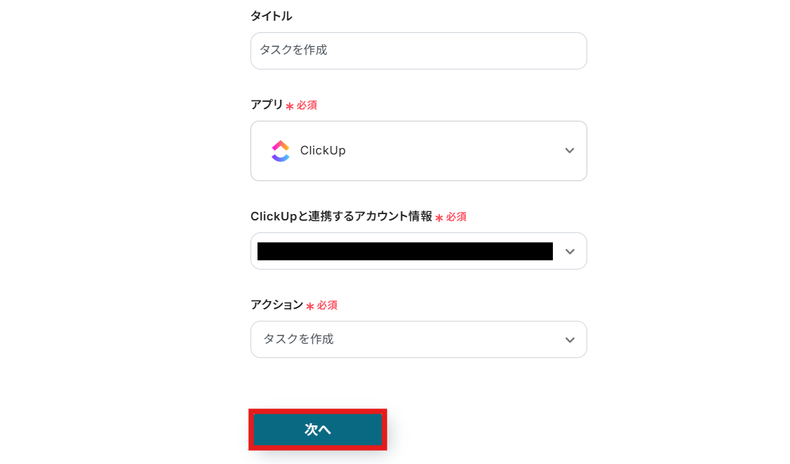 アクションに「タスクを作成」を選んだら、次へ進みます。