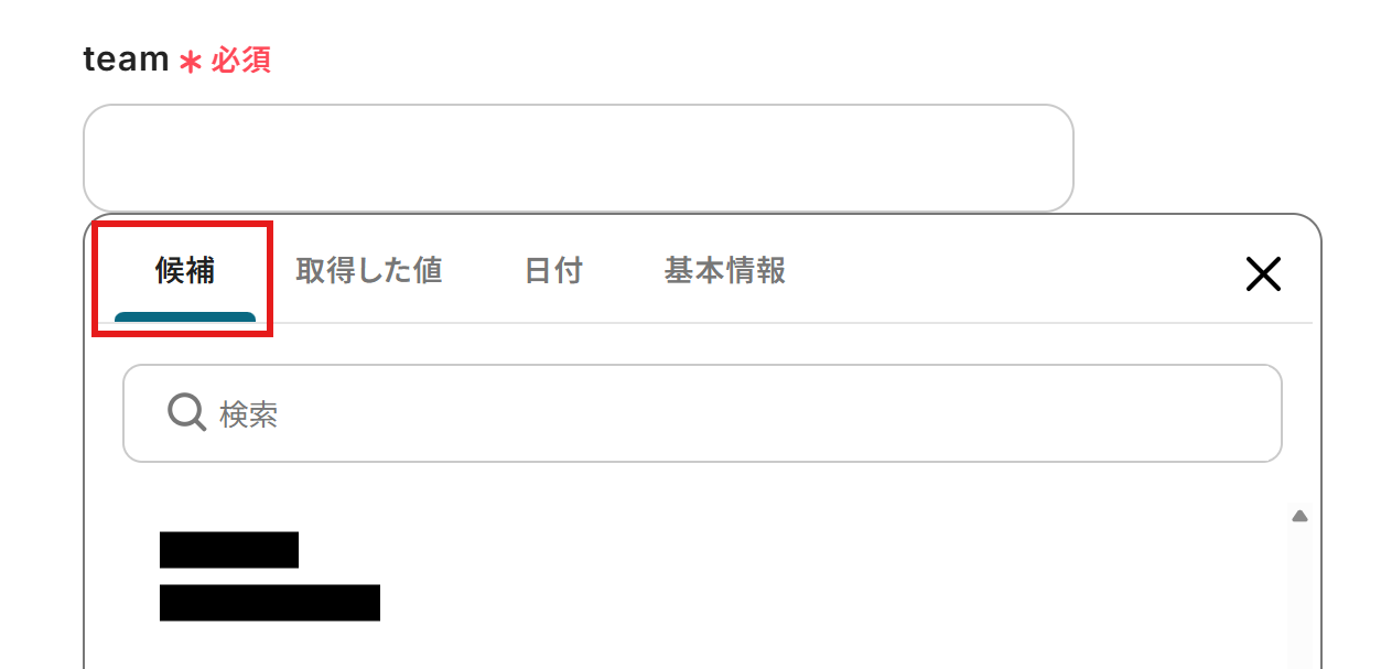 team・space・folder・list_id:入力欄をクリックすると以下のように候補が表示されるので、その中から選択しましょう。teamから設定しないと他の項目の候補が表示されないため、team→space→folder→list_idの順に設定するようにしましょう。もし候補がうまく表示されない場合は、マイアプリ連携の設定をもう一回チェックしてみてください。