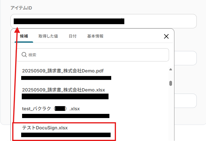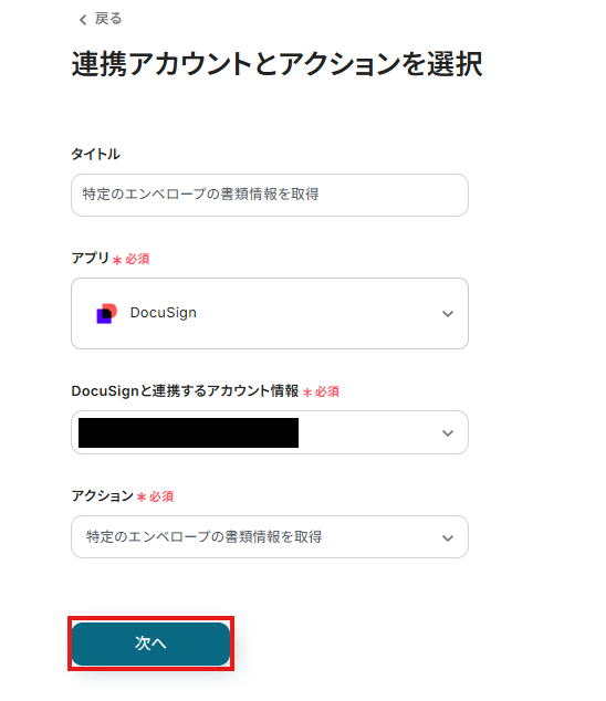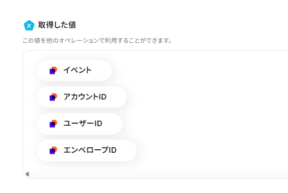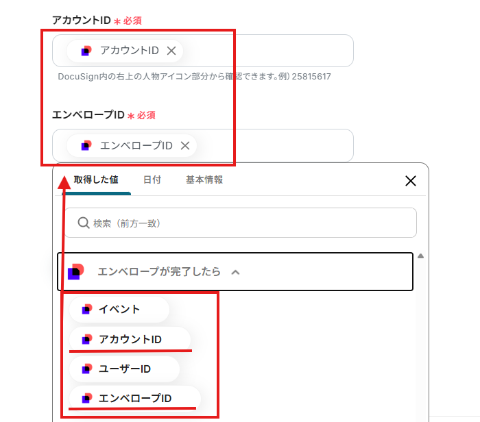 「アカウントID」「エンベロープID」は、入力欄をクリックして表示されるアウトプット(取得した値)から選択してください。