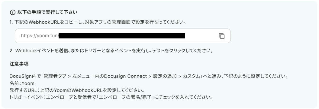 URLをコピーしたら、DocuSignの以下画面で、注意事項に従って設定します。