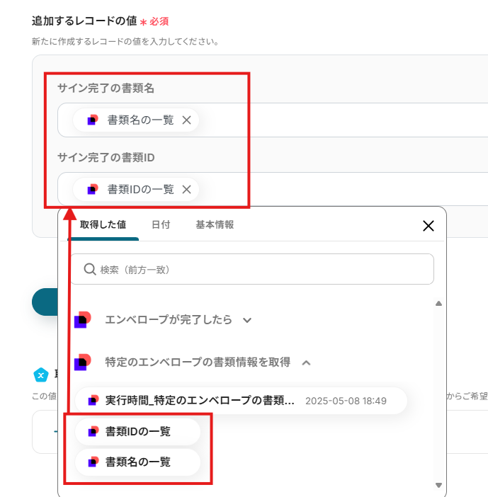 「追加するレコードの値」の各項目は、入力欄をクリックして表示されるアウトプット(取得した値)から選択してください。