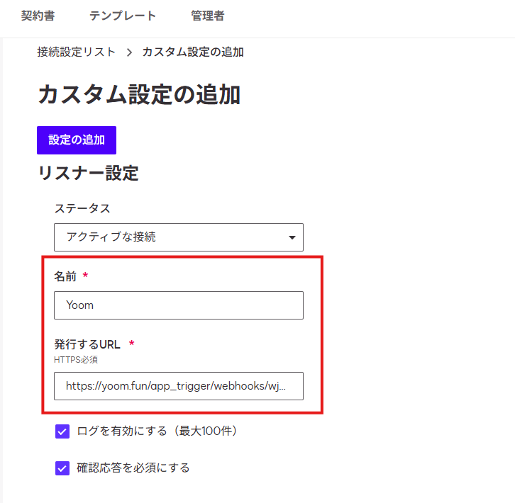 3.表示された画面で、Webhookイベント受信設定を行います。