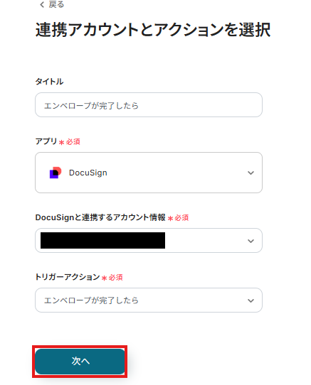 連携するアカウント情報には、ステップ1で連携したアカウント情報が反映されています。トリガーアクションはそのままにして、「次へ」をクリックしてください。