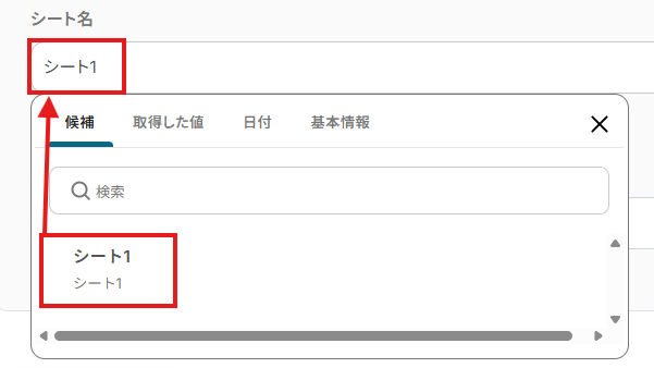「シート名」は、更新したいシート名を、入力欄をクリックして表示される候補から選択するか、直接入力してください。