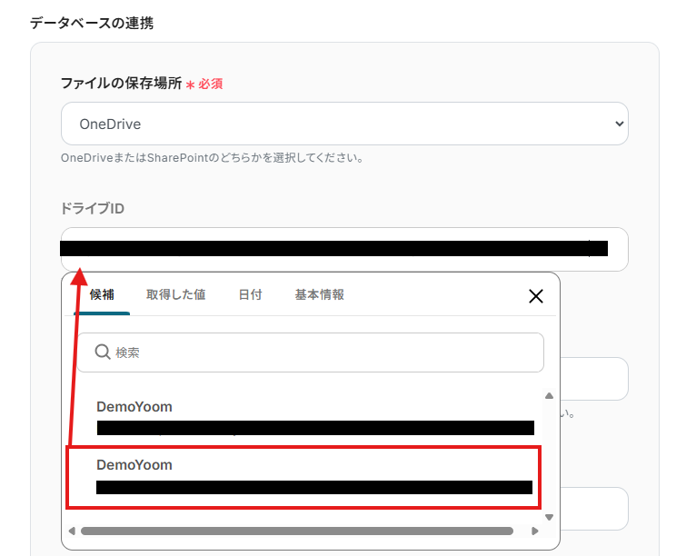 「ドライブID」は、入力欄をクリックして表示される候補から選択してください。