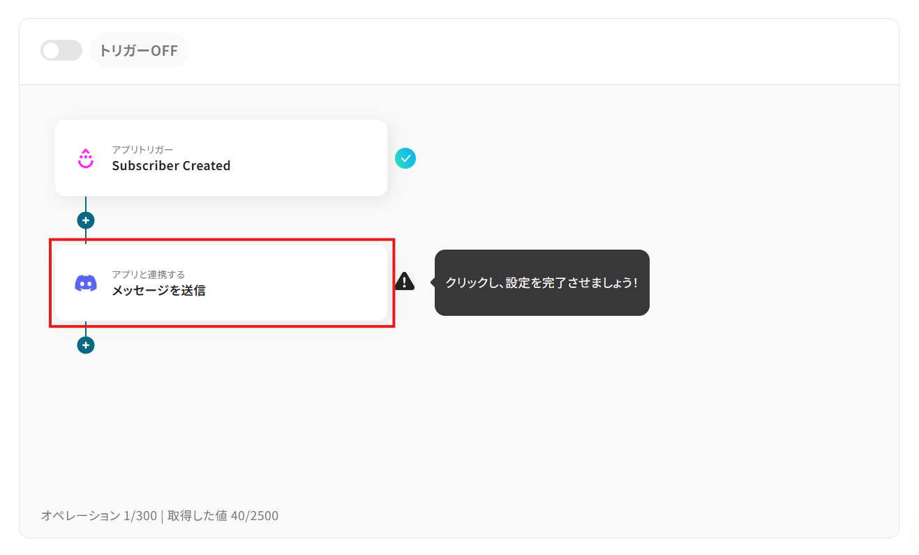 - 最後に、オペレーションでDiscordの「メッセージを送信」アクションを設定し、Subscriberが作成された旨を通知するように設定します。