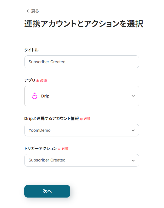 先ずは、フローの起点となるDripのトリガーアクション(Webhook)を設定していきます。
