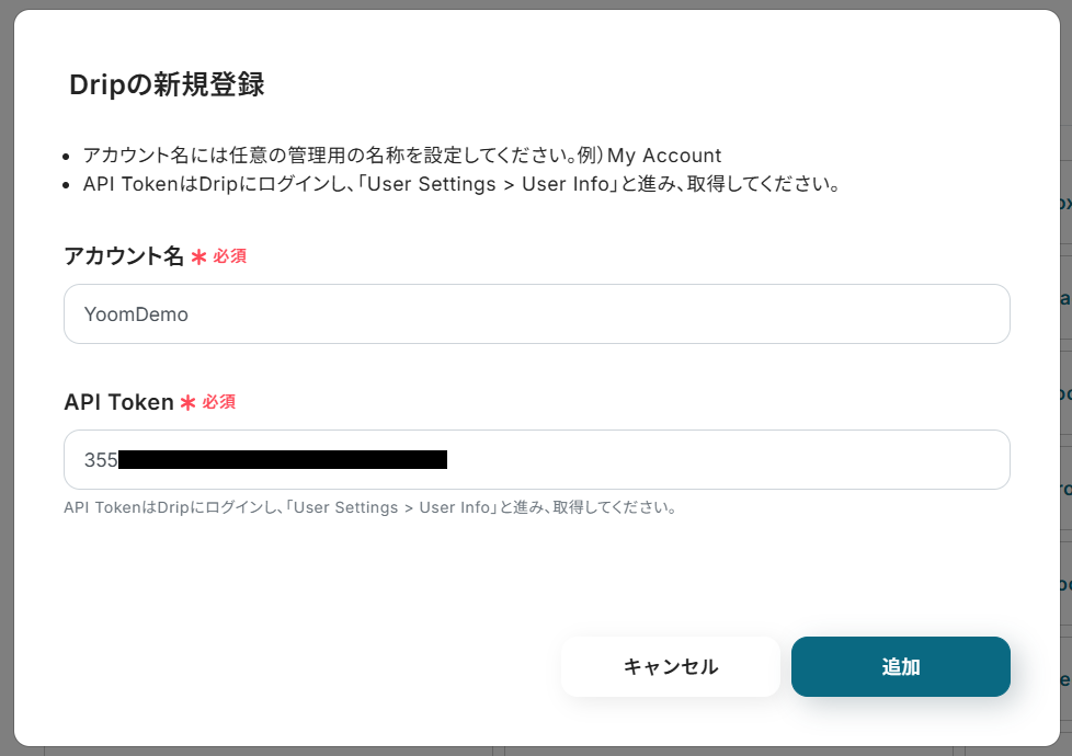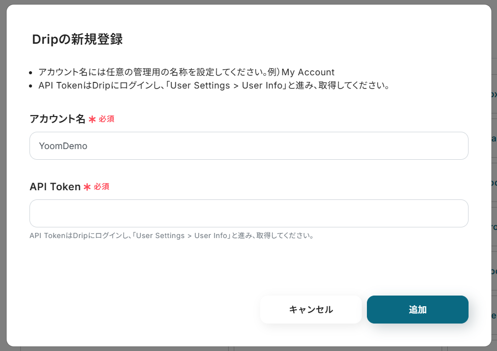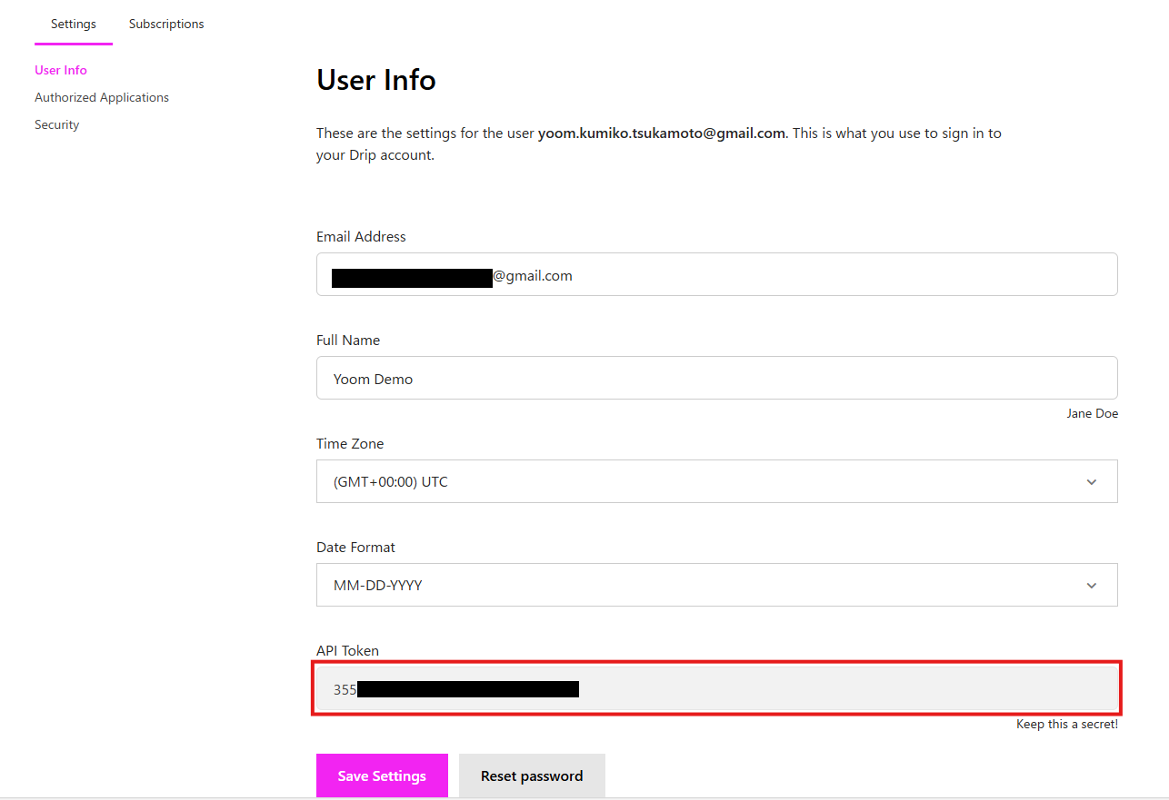 - 「User Info」の下部に表示されている「API Token」を取得し、Yoom側の「API Token」に設定。