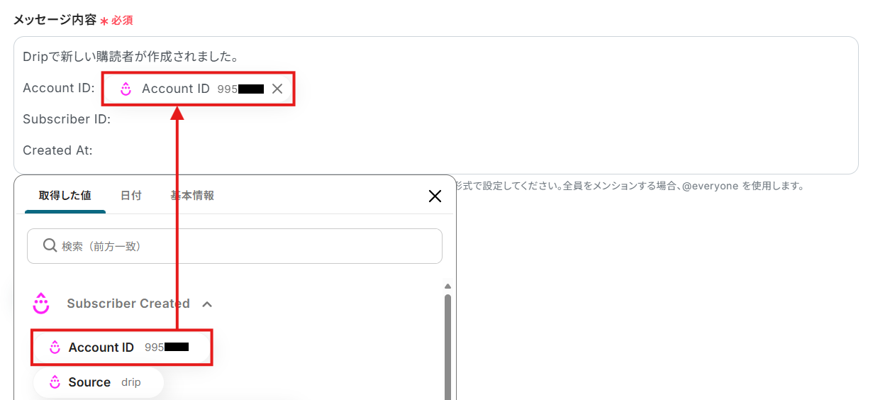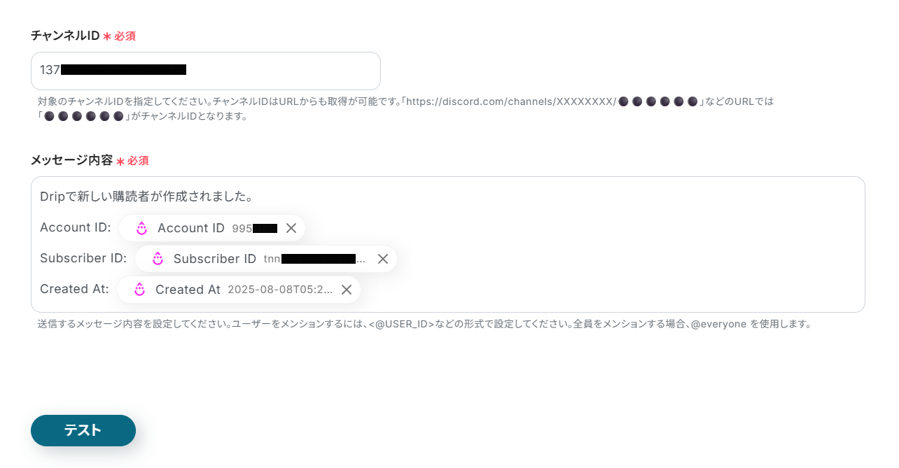 - 同じくDiscordのアクション設定で、送信するメッセージ内容を自由に設定してください。Dripから取得した情報などを活用して、必要な情報が伝わるようにカスタマイズできます。